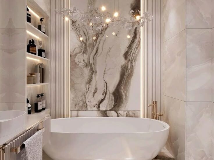 | Prabangus klasikinis | Marmuro ar granito imitacijos, blizgios tekstūros plytelės | Derinti su aukso detalėmis, veidrodiniais paviršiais ir simetrija |